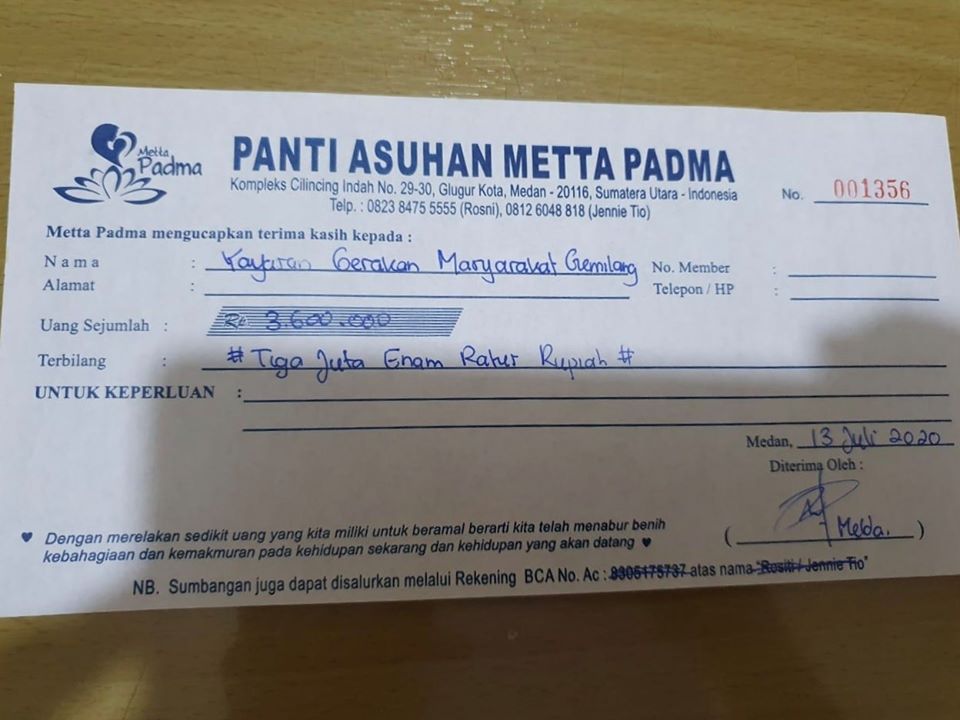 Telah di serahkan bantuan Rp 3.600.000 untuk kebutuhan makanan kepada panti asuhan metta padma menggunakan uang kas GMG ( gabungan sumbangan dari para donatur dan teman teman GMG ke rek yayasan GMG ).