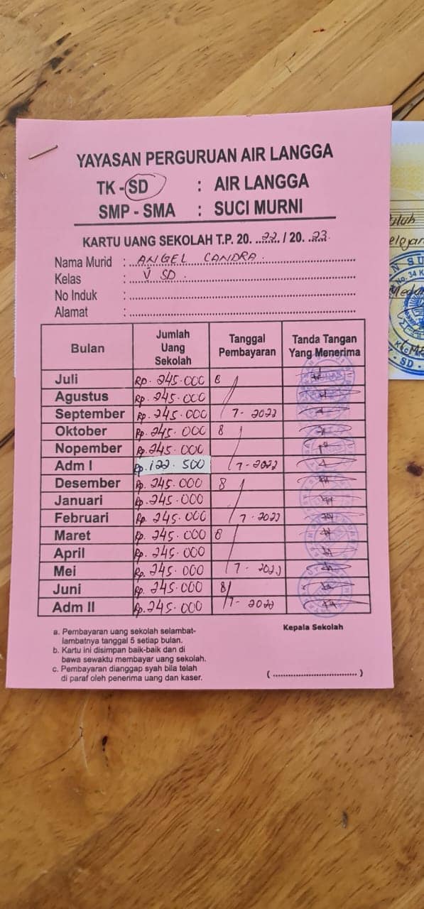 Telah di lunaskan uang sekolah angel Chandra selama satu tahun :
