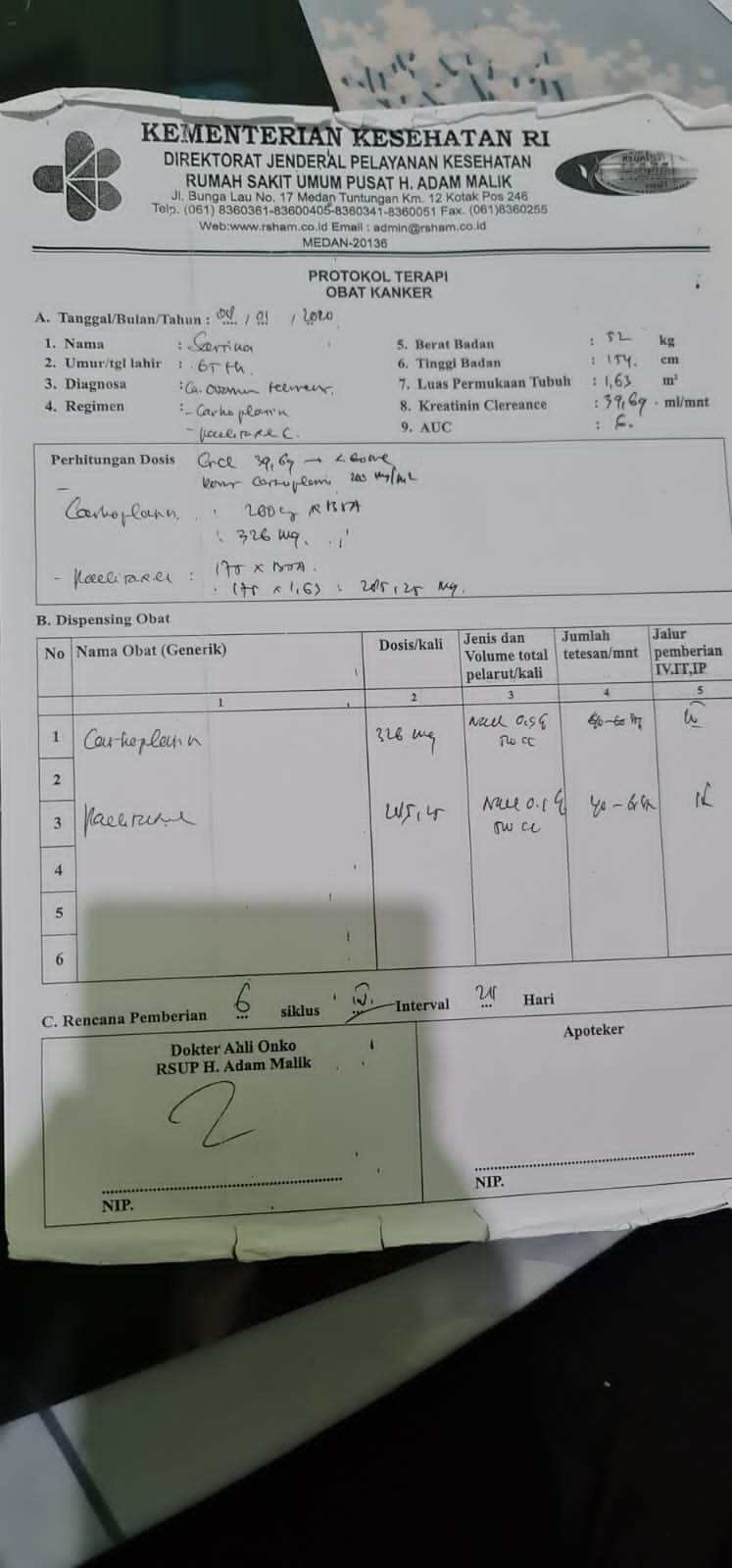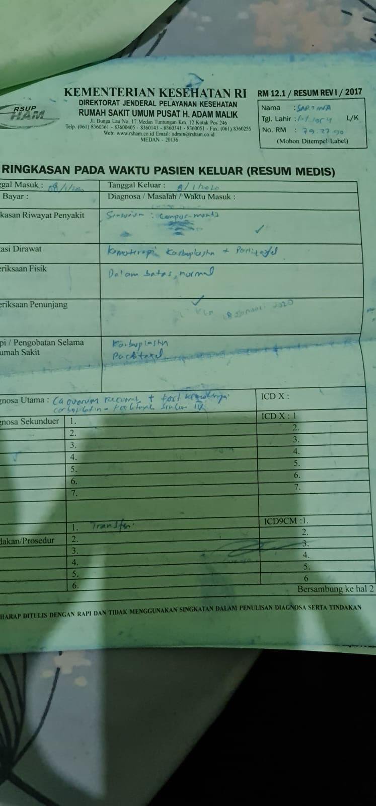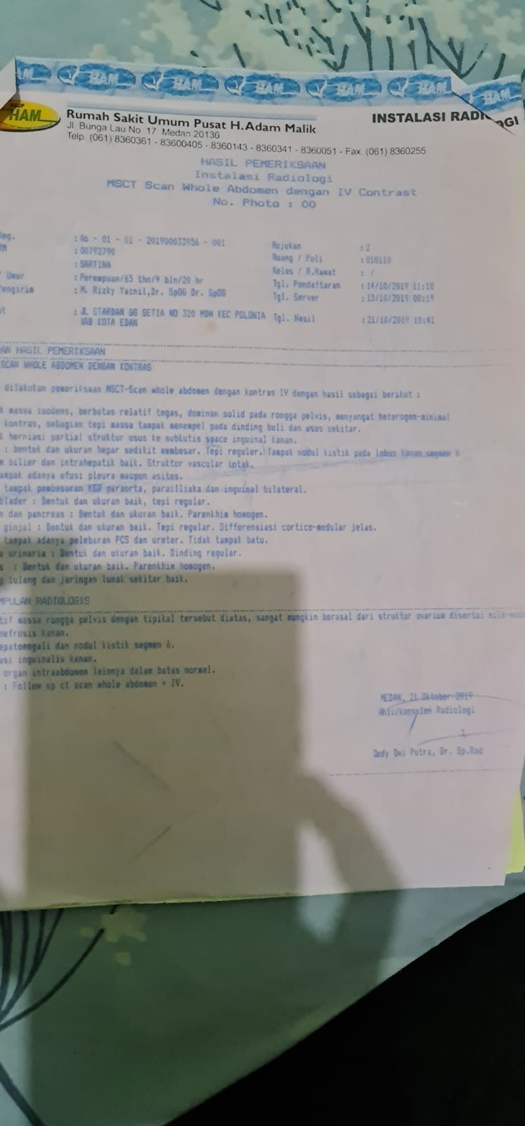 Kepada ibu Sartina umur 65 tahun untuk biaya pengobatan penyakit Kanker Ovarium, yang membuat ibu sartina sering pendarahan.