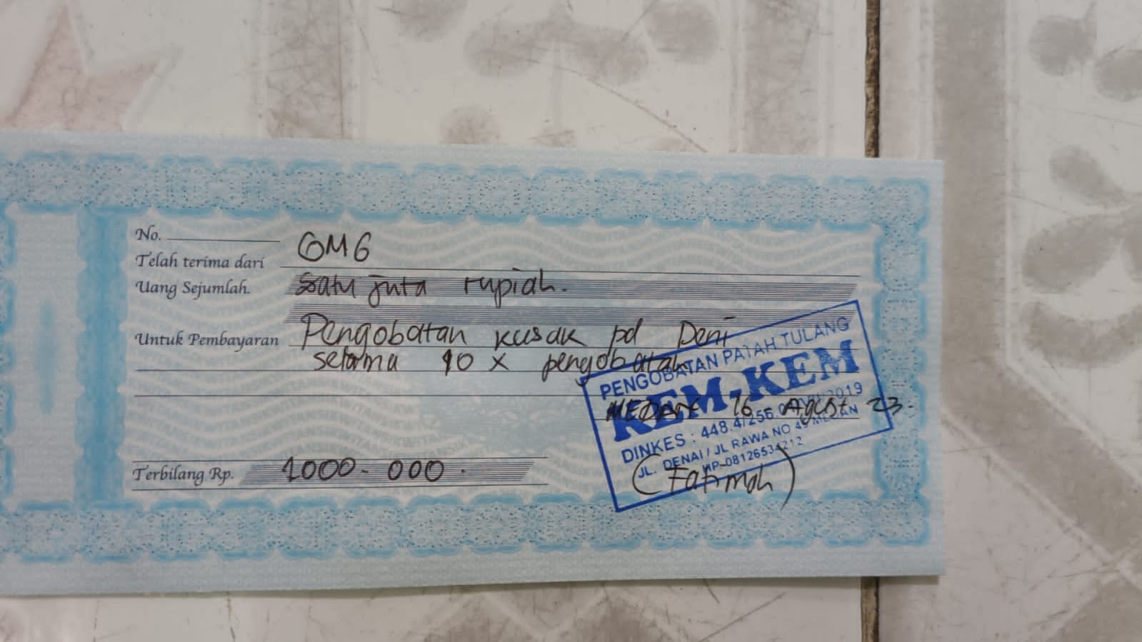 Telah diberikan bantuan pembayaran pengobatan patah tulang untuk 10 kali pengobatan di tukang kusuk kem kem