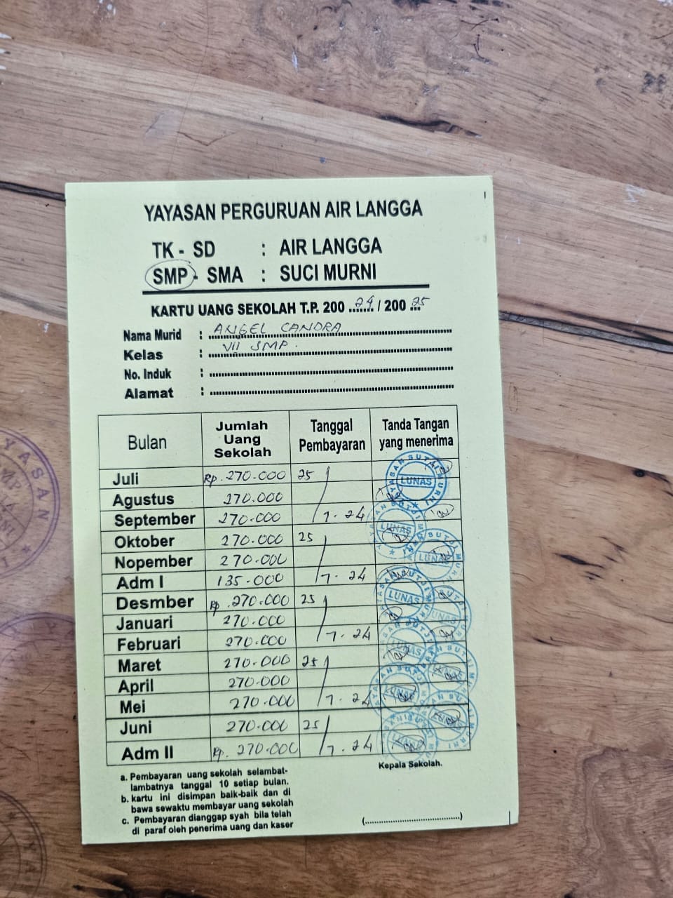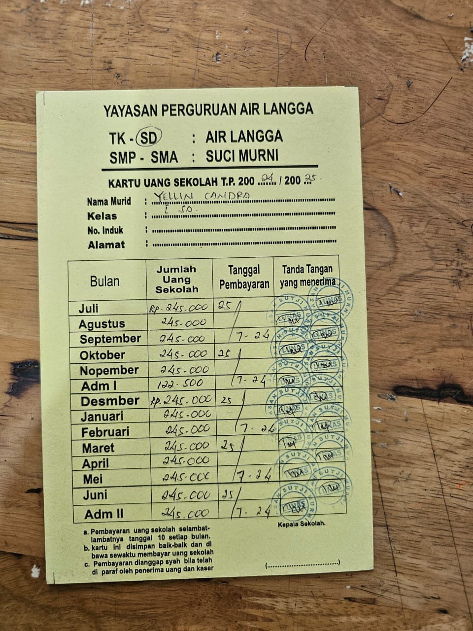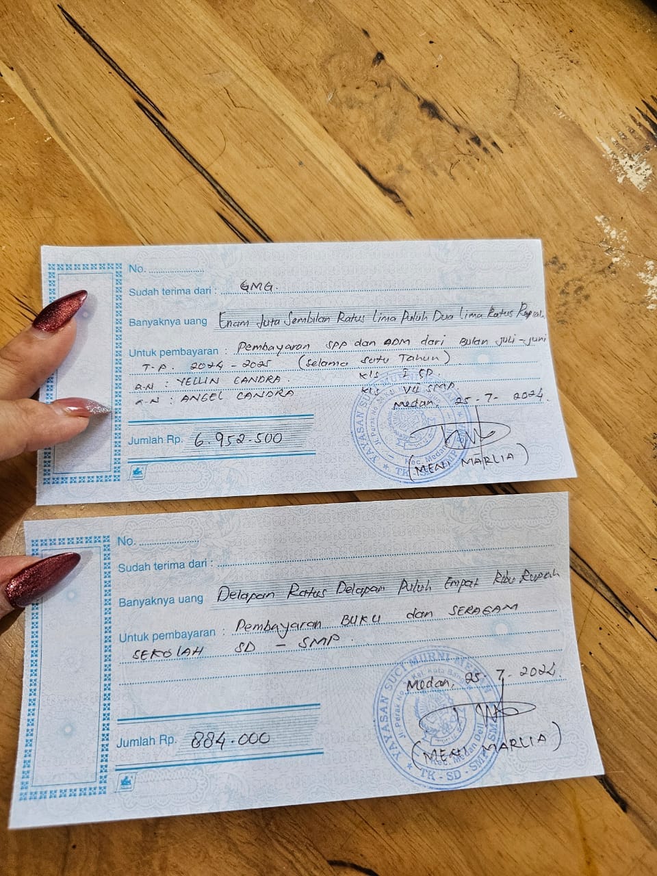 Telah dilunaskan pembayaran uang sekolah Angel Candra kelas VII SMP dan adiknya Yellin Candra kelas 1 SD selama satu tahun.