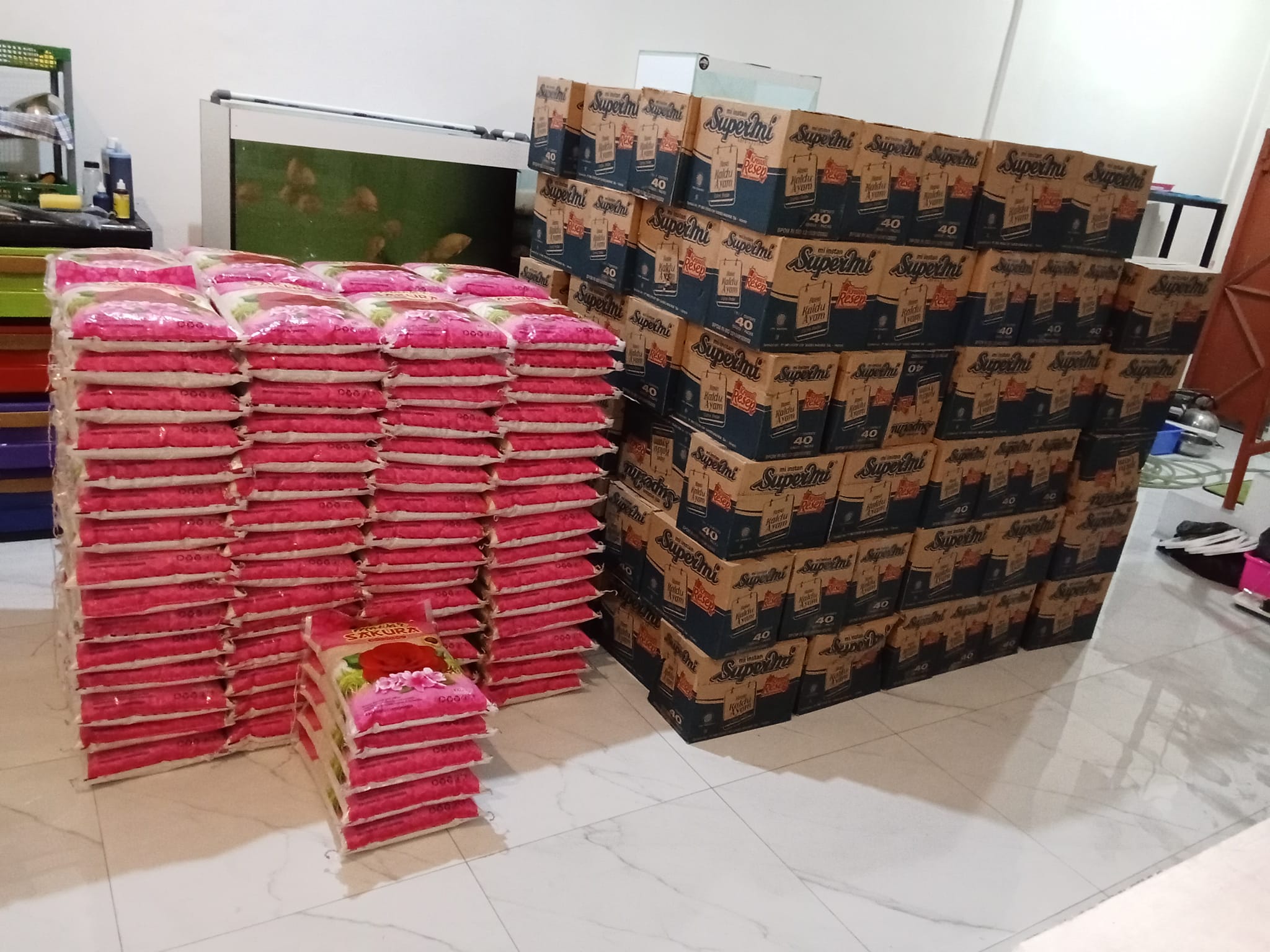 BAGI BERAS 5 KG 30 GONI SUPERMIE 30 KOTAK GULA PUTIH 1KG 30 BUNGKUS MINYAK GORENG 1L 30 BUNGKUS