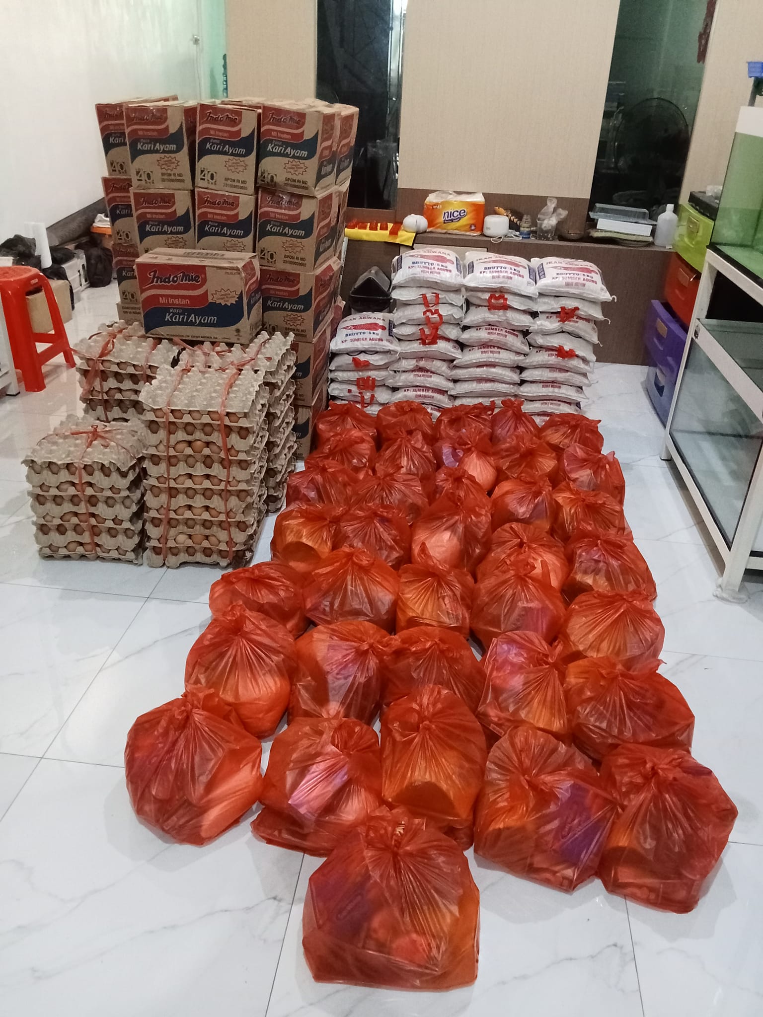 BAGI BERAS 5 KG 30 GONI SUPERMIE 30 KOTAK MINYAK GORENG 1L 30 BUNGKUS TELUR 30 PAPAN